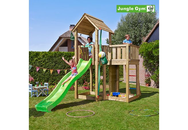 En avundsvärd lekplats med stor plattform Jungle Gym Mansion ger anledning till avundsjuka på många lekplatser och är ett stort, klassiskt lektorn till den lite kräsna kunden. Förskjutna in- och utgångar till denna lyxiga ""egendomen"" ger ytterligare möjlighet till att gå på upptäcktsfärd. En öppen balkong ger en förtrollande utsikt över den traditionella gårdsplatsen eller de viktorianska trädgårdarna. Den färgglada ratten och spann-modulen är attraktiva och stimulerande element på denna klätterställning. Med en ståhöjd på över 160 cm är Jungle Gym Mansion perfekt för såväl individuell lek som socialt umgänge. Kan med fördel byggas ut med Climb eller Swing Modul X'tra eller en av de andra roliga och finurliga modulerna i Jungle Gym-serien, så att platsen i trädgården kan utnyttjas till max och det skapas plats för många timmars härlig lek. Inklusive klättervägg, spannmodul, ratt, grön rutschkana 265 cm och sandlåda. Lektornet består av tryckimpregnerat trä. Testad för kvalitet och säkerhet (enligt EN: 71-1, 2, 3, 8 & 9) CE-godkänd. Lektornet levereras som komplett monteringsset med färdigsågade trälängder. Det är tungt och levereras därför till din address med fraktbil. Lektornets mått: Area exkl. säkerhetsarea: B: 404 x D: 218 x H: 323 cm Area inkl. säkerhetsarea: Det ska finnas en säkerhetsarea på minst 200 cm på alla sidor runt om lektornet. Stolpar: 68 x 68 mm Reglar: 34 x 58 mm Brädor: 16 x 95 mm