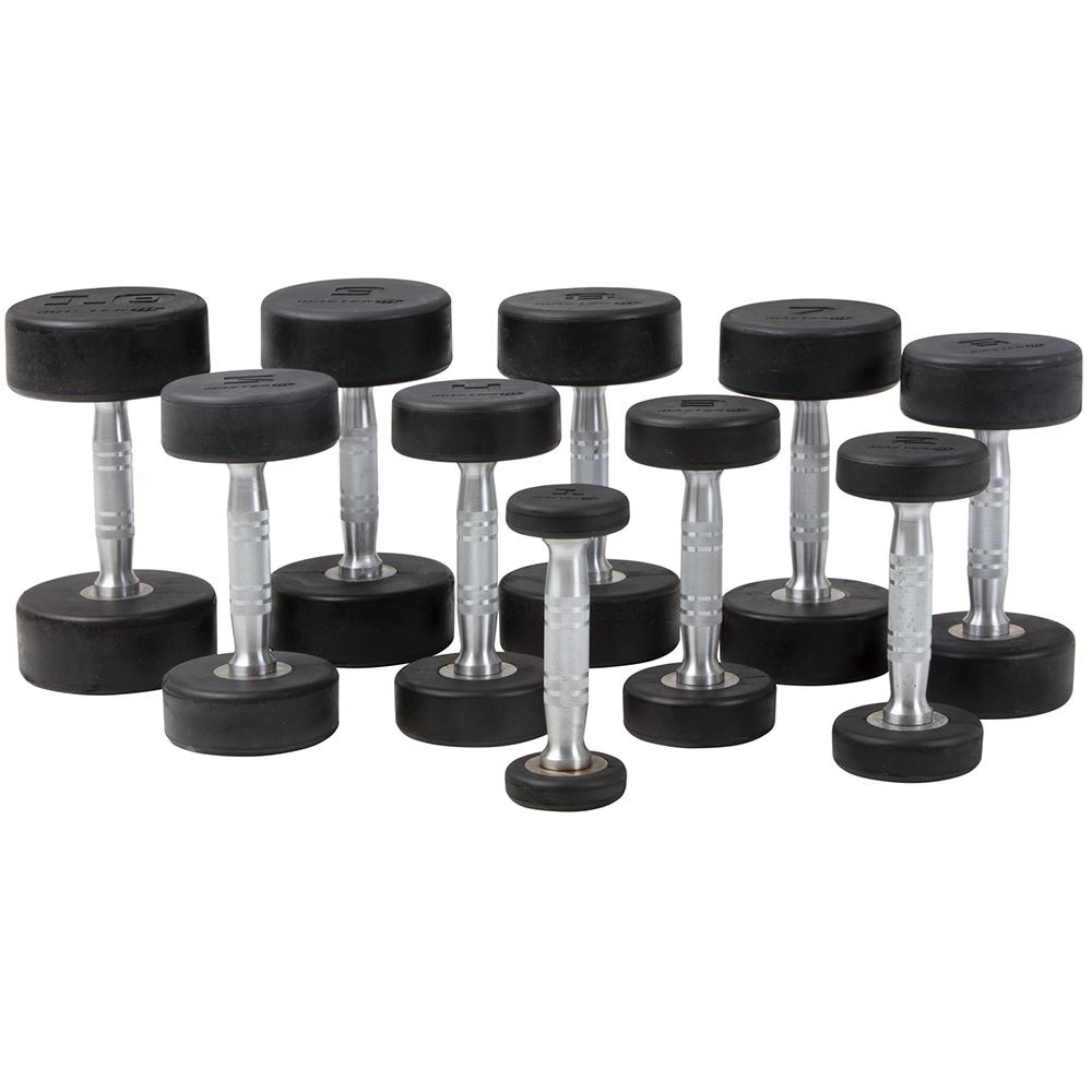 Runda gummihantlar som invändigt består av 100% stål. Rostfritt grepp. 1-10 kg set i en låda. Två hantlar per vikt ingår. Hantlarna har ett ergonomiskt grepp och är tjockast i mitten.