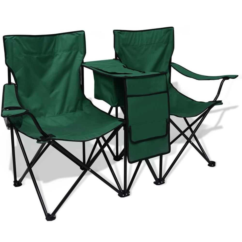 Med detta set har du alltid en bekväm sittplats i trädgården, på campingen, stranden med mera. Stålramen gör stolen stabila och mycket hållbar. Det väderbeständiga och vattentäta polyestertyget är enkelt att rengöra. Eftersom det är enkelt att vika ihop efter användning är detta stolset smidigt att förvara utan att det tar upp för mycket plats. Det har även ryggstöd och armstöd för extra komfort. Med den inbyggda mugghållaren i armstödet har du dryck, snacks och småsaker inom räckhåll. Det mångsidiga bordet kan även användas som ett förvaringsfack för dina tillhörigheter. I leveransen ingår 1 dubbelstol och 1 bärväska. Färg: Grön Mått: 155 x 47 x 84 cm (L x B x H) Material: PVC-belagd 600D textilväv + stålram Med en inbyggd mugghållare Med ett bord/förvaringsfack i mitten Med ryggstöd och armstöd för ökad komfort Hopfällbar för enkel transport och förvaring I leveransen ingår: 1 x Dubbelstol 1 x Bärväska i 210D textilväv Material: Polyester: 100%