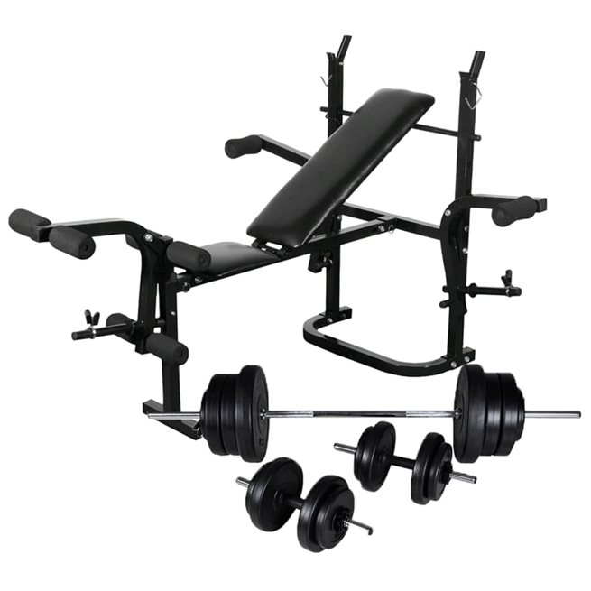 Den mångsidiga viktbänken med ett viktställ och skivstång och hantlar är ett utmärkt val för att träna olika muskelgrupper. Den är ett måste för dig som är ny på viktträning. Utför en bänkpress, curlövningar, bukövningar, sit-ups och pec-övningar med vår viktbänk! Eftersom bekvämligheten under övningar är mycket viktig har viktbänken ett ryggstöd med 4 positioner, är väl vadderad och har skumrullar som stöder knäna. Träning med en skivstången är mycket säker tack vare säkerhetsfästena. Viktbänken kan enkelt vikas ihop och förvaras vertikalt efter användning. Setet med skivstång och hantlar har massiva, krompläterade stänger med fjäderlås (för skivstången), halkfria kannelerade grepp och räfflade skivstångslås (för hantlarna) för säker fastsättning av viktskivorna. Du kan träna utan att behöva oroa dig för säkerheten. Viktskivorna är tillverkade med ett robust hölje i polyeten. De kan kombineras på olika sätt för olika träningssyften. Leveransen inkluderar en viktbänk, en skivstång, två hantlar, sex viktskivor på 1,25 kg, fyra viktskivor på 2,5 kg, fyra viktskivor på 5 kg, två viktskivor på 10 kg, fyra skivstångslås och två fjäderlås. Träningsbänk: Ryggstödet kan justeras i 4 positioner Kan enkelt vikas platt Mått: 147 x 123 x 103 cm (L x B x H) Mått i hopfällt läge: 124 x 80 x 163 cm (L x B x H) Med 2 säkerhetsfästen Stångens diameter: 25 mm Set med skivstång och hantlar: Viktskivor med polyetenhölje Greppstorlek: ca. 14,5 cm (skivstång), 10 cm (hantel) 1 x 2 kg skivstång: 2,5 x 140 cm (Diameter x L) 2 x 0,5 kg hantelstång: 2,5 x 45 cm (Diameter x L) 6 x 1,25 kg viktskiva: 17,5 x 3 cm (Diameter x T) 4 x 2,5 kg viktskiva: 22 x 4 cm (Diameter x T) 4 x 5 kg viktskiva: 27 x 4,5 cm (Diameter x T) 2 x 10 kg viktskiva: 32 x 5,5 cm (Diameter x T) 4 x Lås 2 x Fjäderlås Totalvikt inklusive stänger: 60,5 kg Total vikt på viktskivorna: 57,5 kg